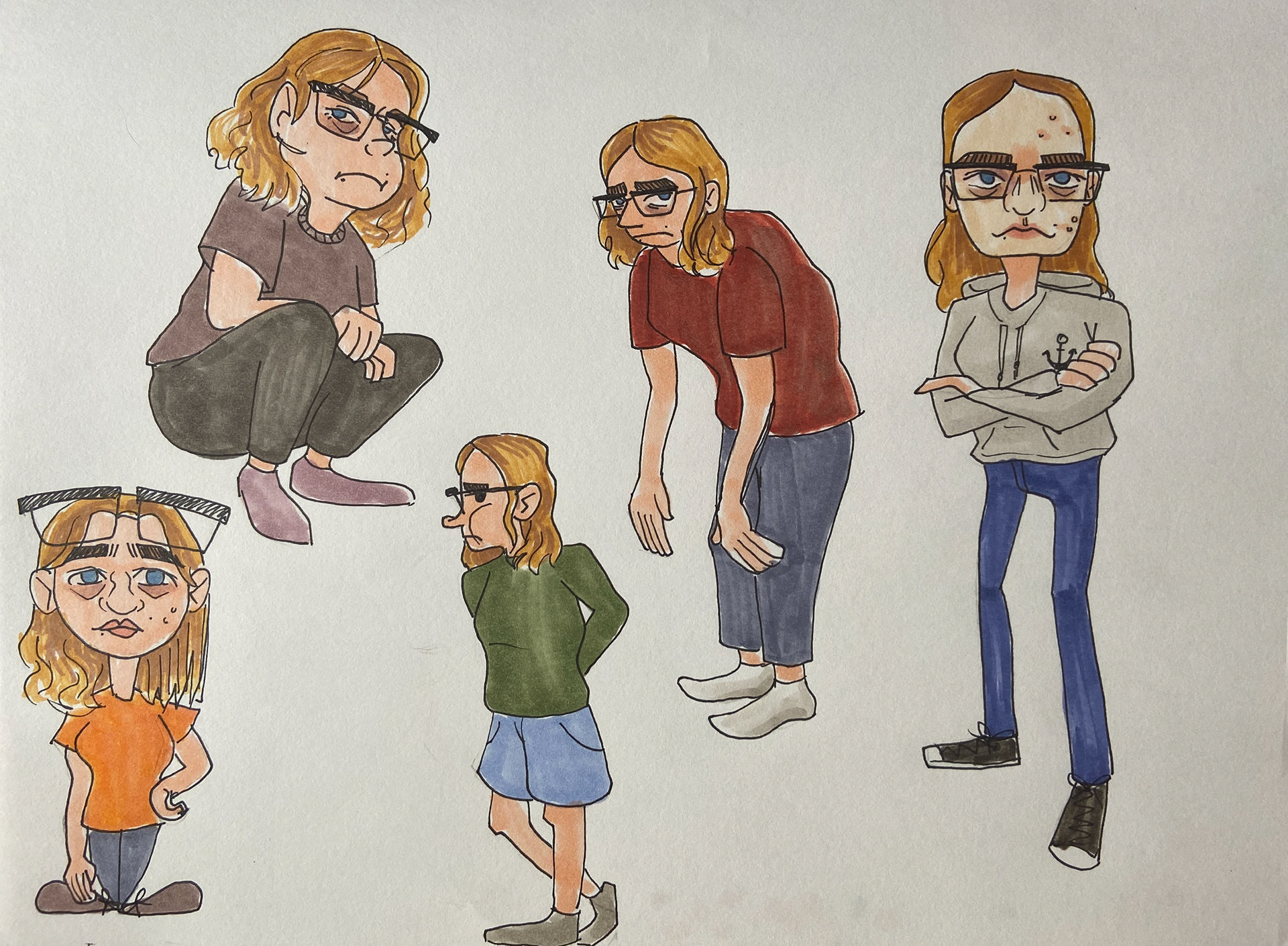 Self-Caricatures drawn traditionally for a Character Design class assignment.